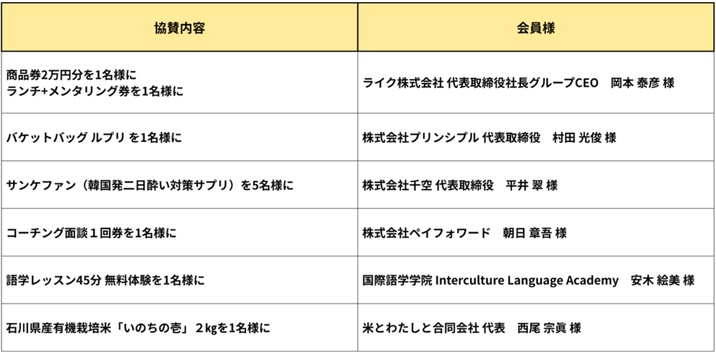 イベント中盤にはビンゴ大会を開催しました。 ビンゴ大会の景品には、会員の皆さまよりさまざまな商品をご協賛いただきました。ご協賛いただいた会員の皆さまに、心より御礼申し上げます。